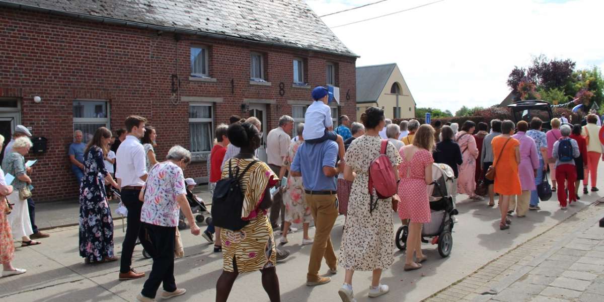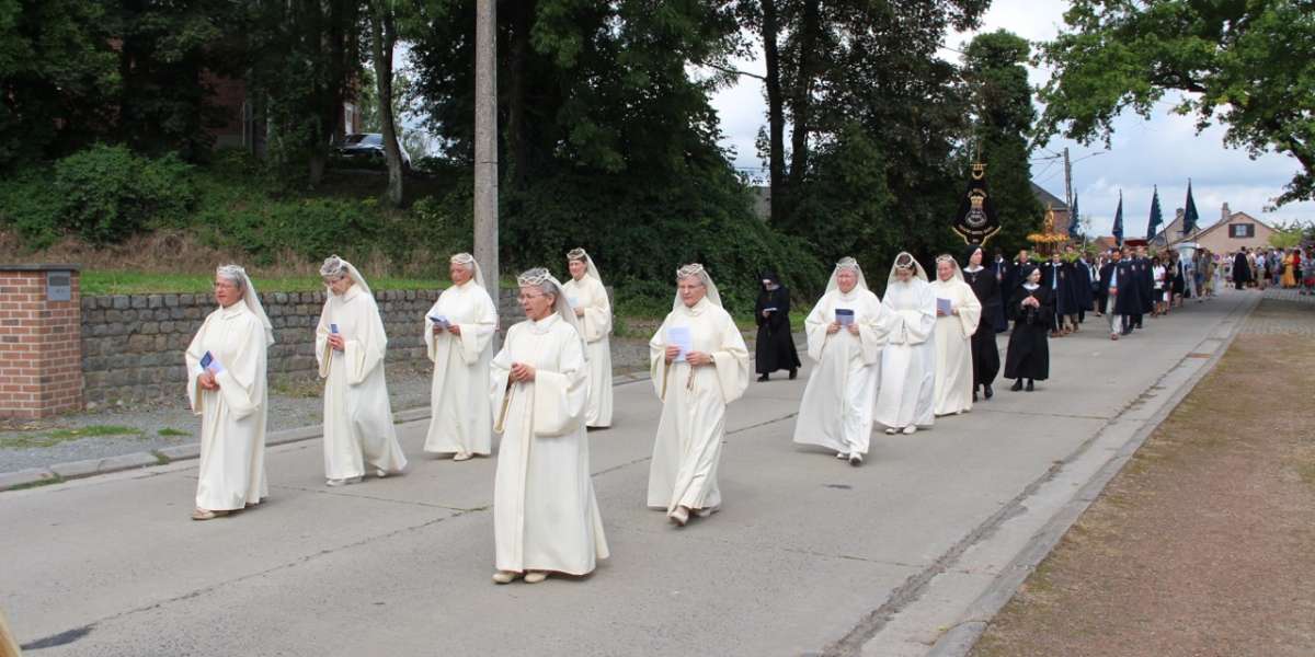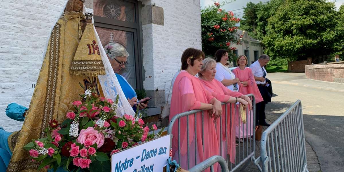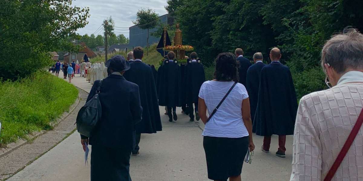 La procession se déroula ensuite vers le Sanctuaire de Villers-Notre-Dame, avec une petite halte à la chapelle Saint-Gérard et à la Chapelle du Moulin. Nous voyons d'abord les groupes habituels, le char de remerciement pour les fruits de la terre, la fanfare des Amis réunis d'Ellezelles, saint Amand et Notre-Dame du Rosaire. Viennent ensuite les groupes invités, une délégation d'Ecosse représentant la Reine Marguerite et portant ses reliques, un groupe portant les reliques des saintes Relinde et Harlinde qui viennent de fêter leur jubilé. Depuis 1388 ce trésor est porté en procession d'Aldeneik à Maaseik tous les vingt-cinq ans. Petite, mais magnifique, Notre-Dame à Cailloux, qui a quitté sa chapelle pour l'occasion, est portée avec fierté par une petite délégation de Meslin l'Évêque. Un groupe de jeunes pèlerins, fraîchement revenus des JMJ s'est retrouvé pour porter ensemble la croix et revivre ainsi les journées exceptionnelles vécues à Lisbonne. Notre-Dame de Villers, portée et entourée par les Pèlerins de la Sedes Sapientiae passe ensuite dans son village, suivie du Saint-Sacrement, le tout précédé par un groupe de Soeurs de L'Œuvre en manteaux de chœur et la Communauté des Servantes des Pauvres de Jemappes.