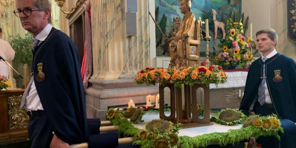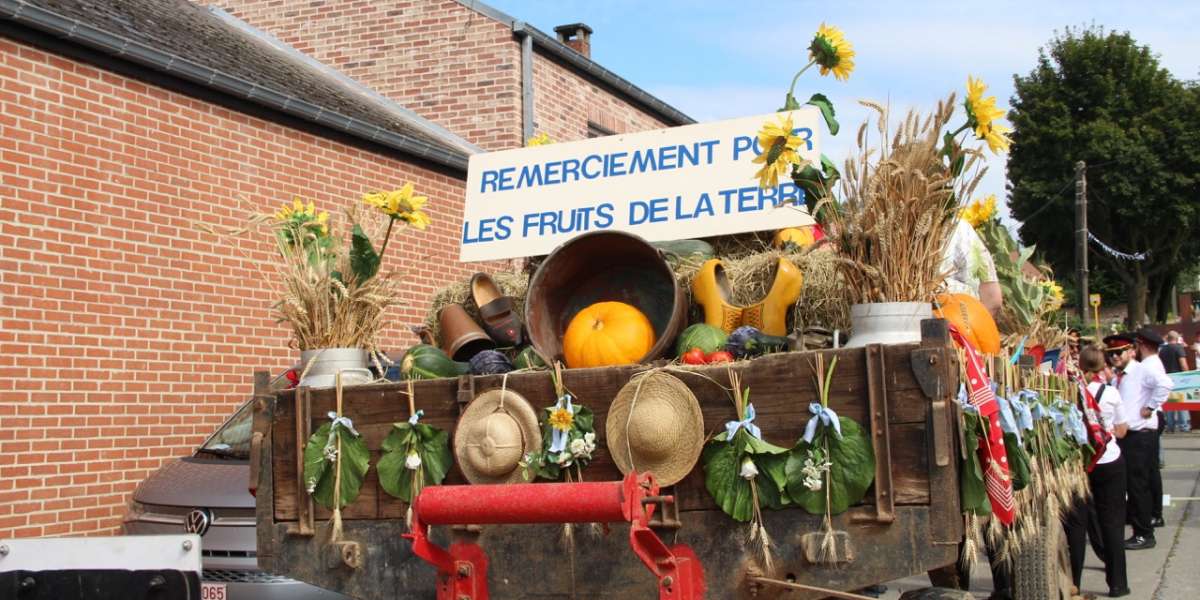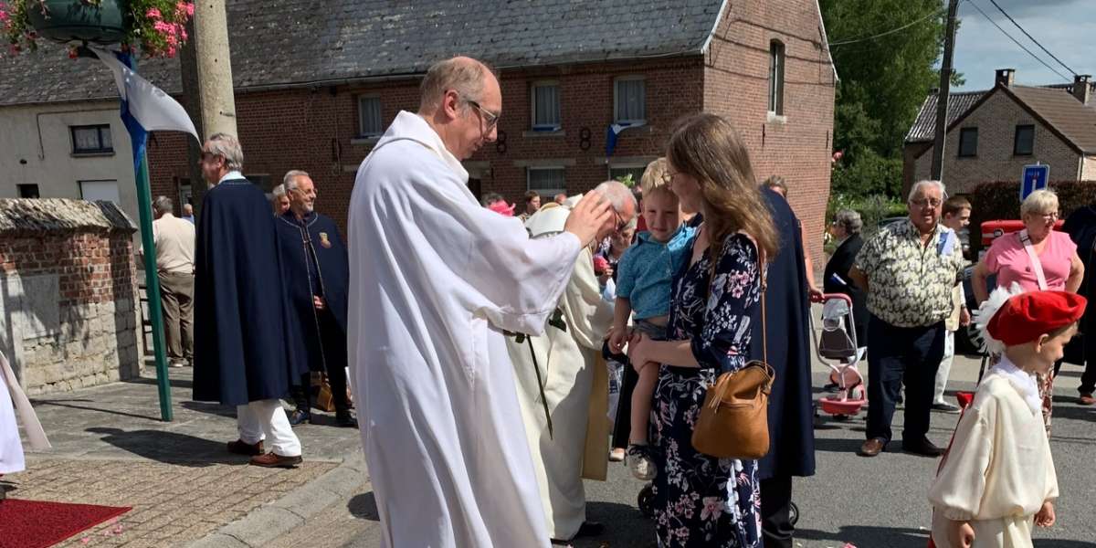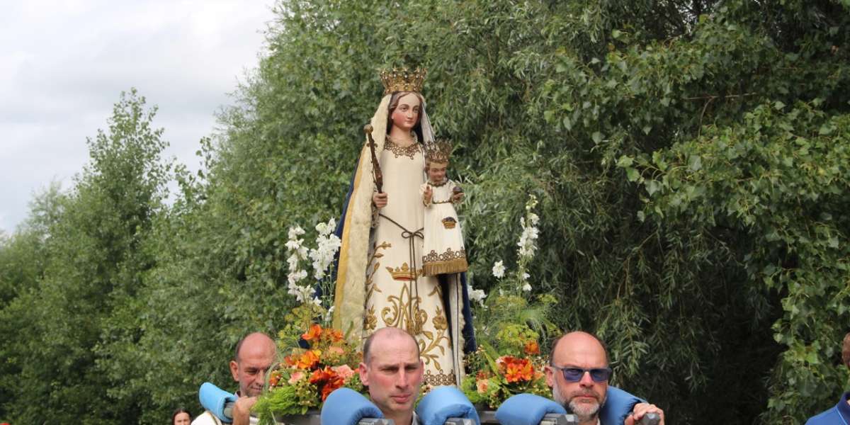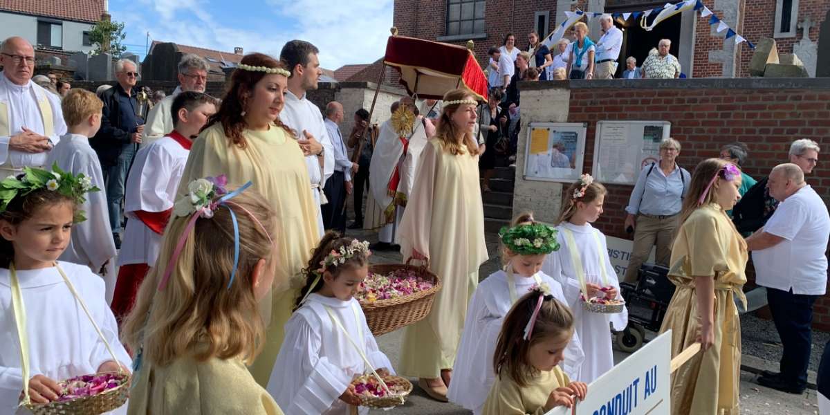 La procession se déroula ensuite vers le Sanctuaire de Villers-Notre-Dame, avec une petite halte à la chapelle Saint-Gérard et à la Chapelle du Moulin. Nous voyons d'abord les groupes habituels, le char de remerciement pour les fruits de la terre, la fanfare des Amis réunis d'Ellezelles, saint Amand et Notre-Dame du Rosaire. Viennent ensuite les groupes invités, une délégation d'Ecosse représentant la Reine Marguerite et portant ses reliques, un groupe portant les reliques des saintes Relinde et Harlinde qui viennent de fêter leur jubilé. Depuis 1388 ce trésor est porté en procession d'Aldeneik à Maaseik tous les vingt-cinq ans. Petite, mais magnifique, Notre-Dame à Cailloux, qui a quitté sa chapelle pour l'occasion, est portée avec fierté par une petite délégation de Meslin l'Évêque. Un groupe de jeunes pèlerins, fraîchement revenus des JMJ s'est retrouvé pour porter ensemble la croix et revivre ainsi les journées exceptionnelles vécues à Lisbonne. Notre-Dame de Villers, portée et entourée par les Pèlerins de la Sedes Sapientiae passe ensuite dans son village, suivie du Saint-Sacrement, le tout précédé par un groupe de Soeurs de L'Œuvre en manteaux de chœur et la Communauté des Servantes des Pauvres de Jemappes.