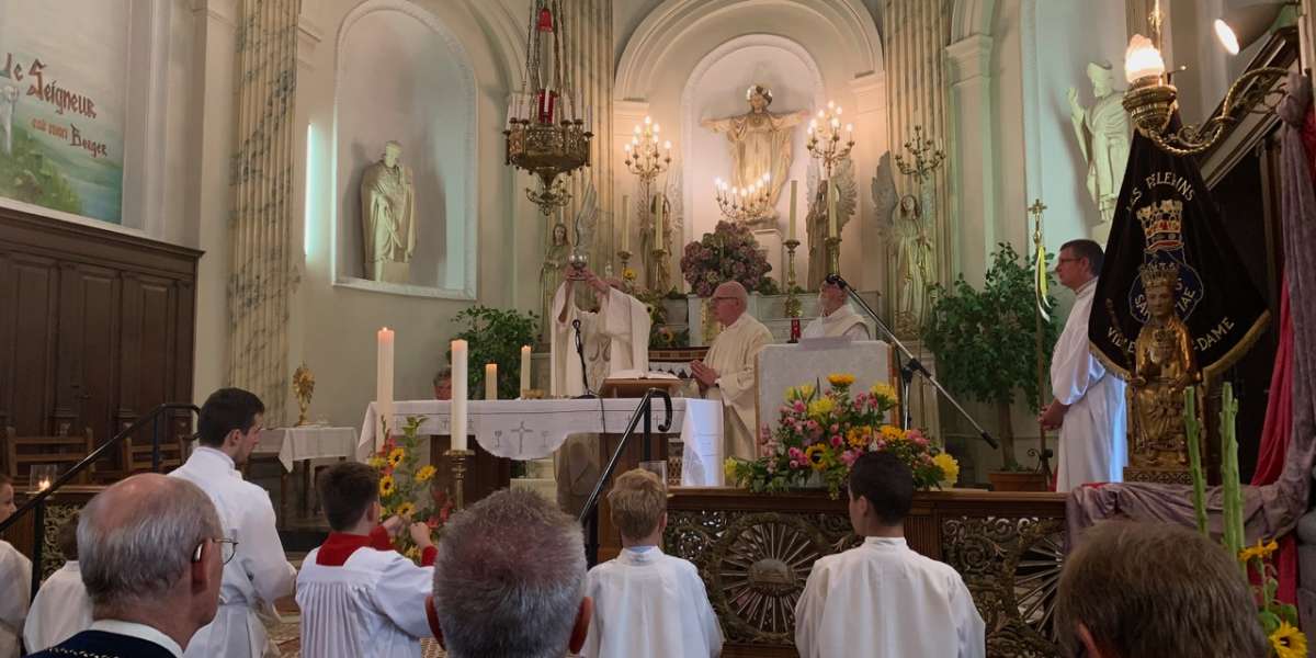 Les paroissiens des deux Villers et allentours, les pèlerins et les amis se rassemblèrent d'abord en l'église de Villers-Saint-Amand autour de Monsieur l'Abbé Xavier Nys, Curé de l'Unité pastorale, pour célébrer l'Eucharistie en français et en néerlandais, avec une petite touche d'anglais. Le Credo en latin fut l'occasion d'exprimer l'universalité de l'Église et la communion de tous les participants.