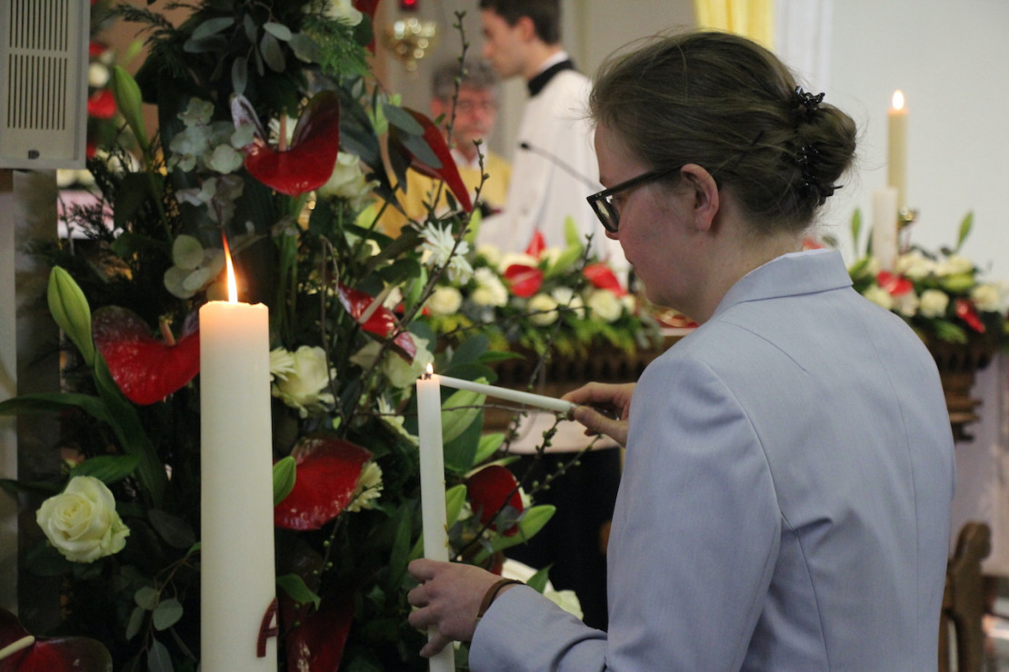 Soeur Ellen a reçu un manteau de choeur blanc et une bague, signes du fait que le Christ l'a choisie pour son épouse. Ceux-ci lui ont été remis par Mère Marguerite Binder, la Supérieure Générale de la Communauté des Soeurs de l'Oeuvre. Un moment particulièrement touchant a été celui où Soeur Ellen, vêtue du manteau de choeur la toute première fois, est entrée dans l'eglise portant dans sa main une lampe remplie d'huile. Cela a fait penser à la parabole des cinq vierges sages et des cinq vierges folles qui se trouve dans l'évangile. (Mt. 25, 1-13).