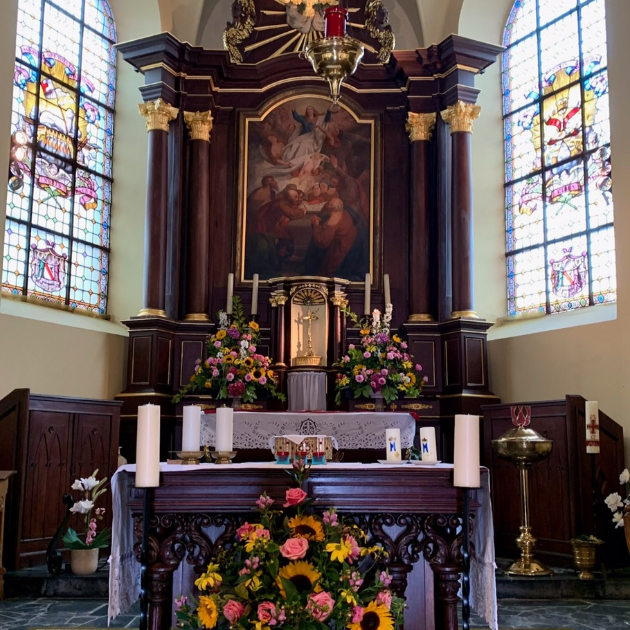 Les paroissiens des deux Villers et allentours, les pèlerins et les amis se rassemblèrent d'abord en l'église de Villers-Saint-Amand autour de Monsieur l'Abbé Xavier Nys, Curé de l'Unité pastorale, pour célébrer l'Eucharistie en français et en néerlandais, avec une petite touche d'anglais. Le Credo en latin fut l'occasion d'exprimer l'universalité de l'Église et la communion de tous les participants.